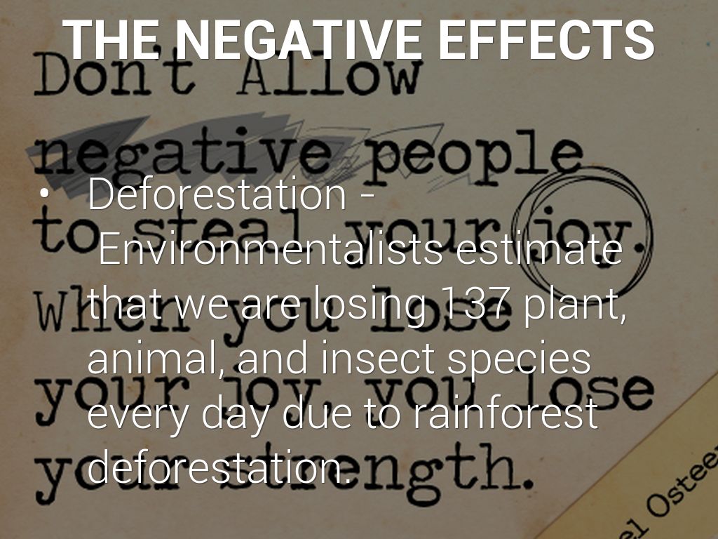 Deforestation - Environmentalists estimate that we are losing 137 plant, animal, and insect species every day due to rainforest deforestation.