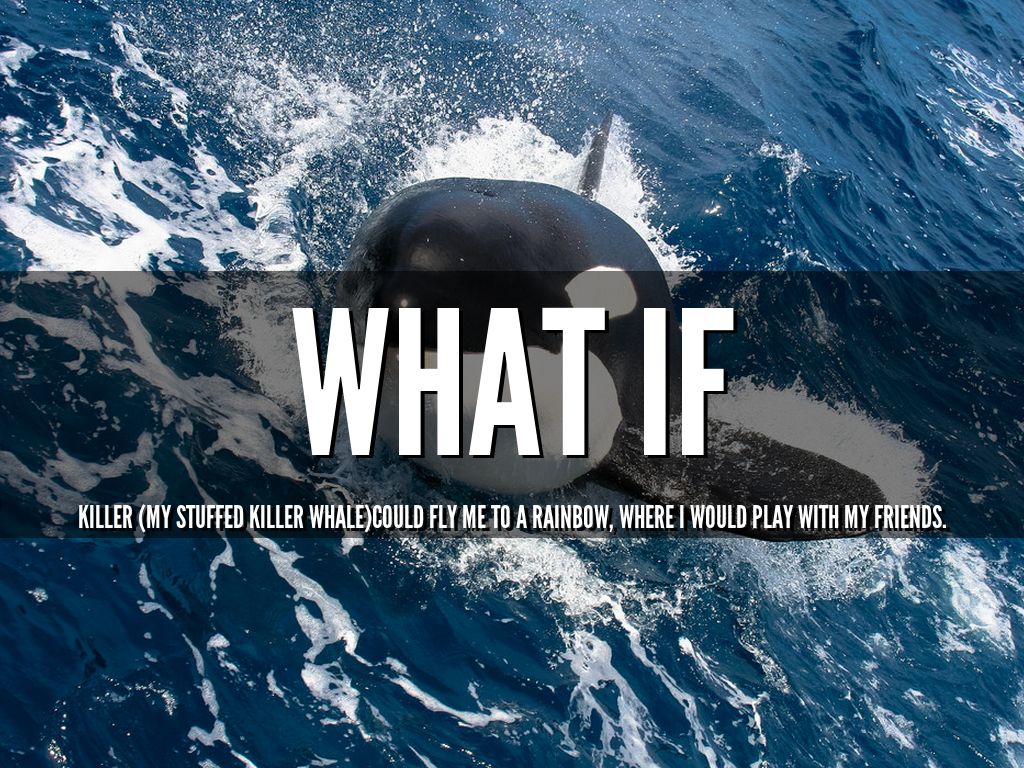 KILLER (MY STUFFED KILLER WHALE)COULD FLY ME TO A RAINBOW, WHERE I WOULD PLAY WITH MY FRIENDS.