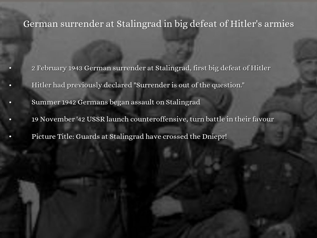 2 February 1943 German surrender at Stalingrad, first big defeat of Hitler