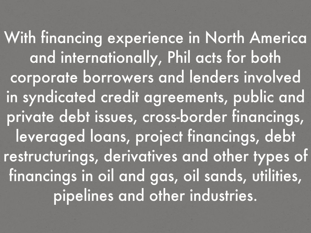 With financing experience in North America and internationally, Phil acts for both corporate borrowers and lenders involved in syndicated credit agreements, public and private debt issues, cross-border financings, leveraged loans, project financings, debt restructurings, derivatives and other types of financings in oil and gas, oil sands, utilities, pipelines and other industries.