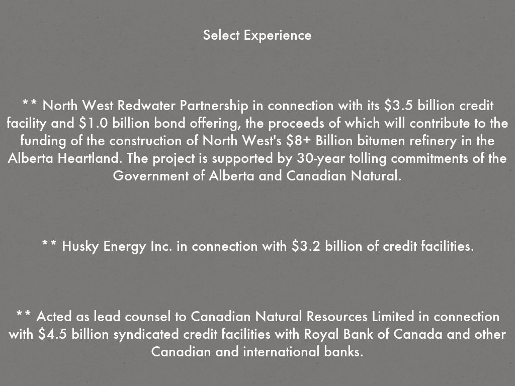 ** Acted as lead counsel to Canadian Natural Resources Limited in connection with $4.5 billion syndicated credit facilities with Royal Bank of Canada and other Canadian and international banks.