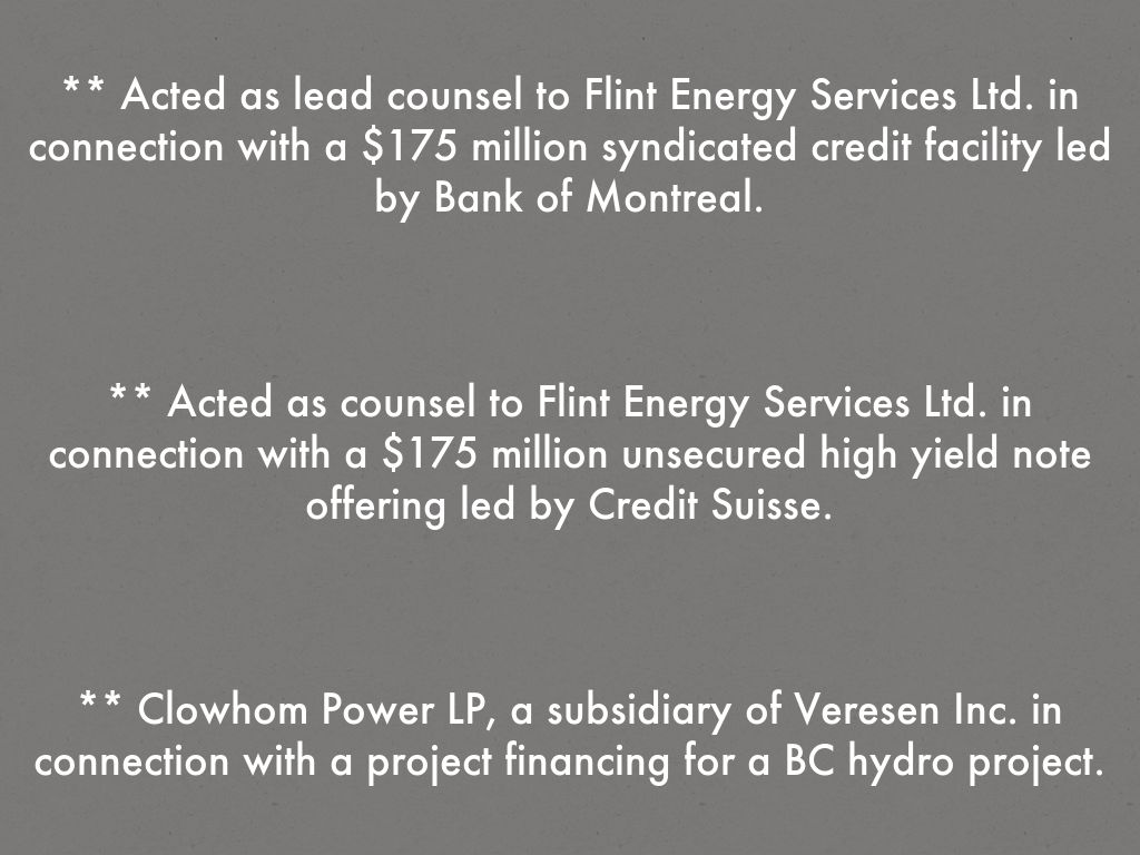 ** Acted as lead counsel to Flint Energy Services Ltd. in connection with a $175 million syndicated credit facility led by Bank of Montreal.
