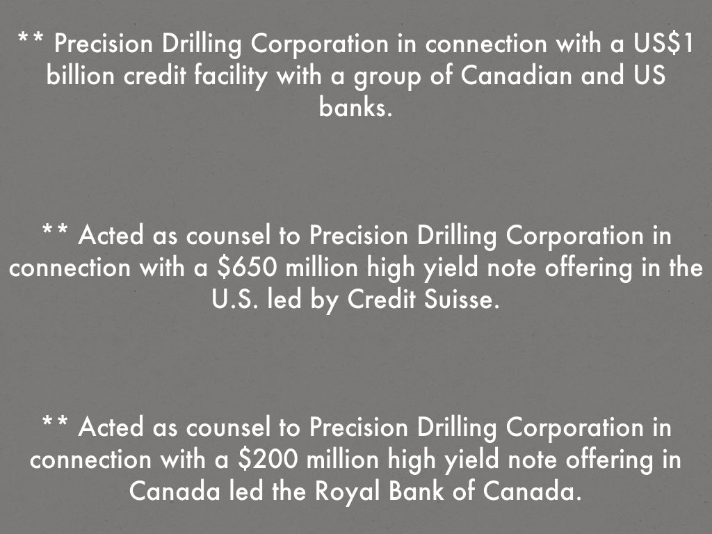** Acted as counsel to Precision Drilling Corporation in connection with a $200 million high yield note offering in Canada led the Royal Bank of Canada.