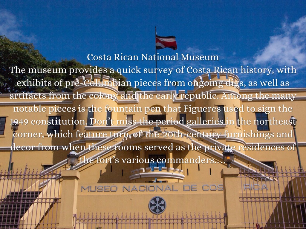 Costa Rican National Museum The museum provides a quick survey of Costa Rican history, with exhibits of pre-Columbian pieces from ongoing digs, as well as artifacts from the colony and the early republic. Among the many notable pieces is the fountain pen that Figueres used to sign the 1949 constitution. Don’t miss the period galleries in the northeast corner, which feature turn-of-the-20th-century furnishings and decor from when these rooms served as the private residences of the fort’s various commanders.