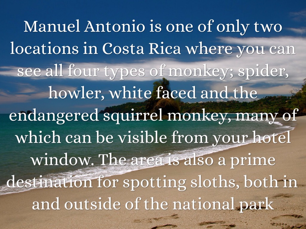 Manuel Antonio is one of only two locations in Costa Rica where you can see all four types of monkey; spider, howler, white faced and the endangered squirrel monkey, many of which can be visible from your hotel window. The area is also a prime destination for spotting sloths, both in and outside of the national park