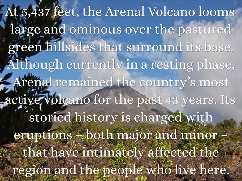 At 5,437 feet, the Arenal Volcano looms large and ominous over the pastured green hillsides that surround its base. Although currently in a resting phase, Arenal remained the country’s most active volcano for the past 43 years. Its storied history is charged with eruptions – both major and minor – that have intimately affected the region and the people who live here.