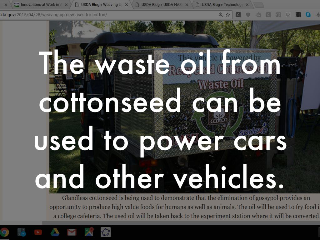 The waste oil from cottonseed can be used to power cars and other vehicles.