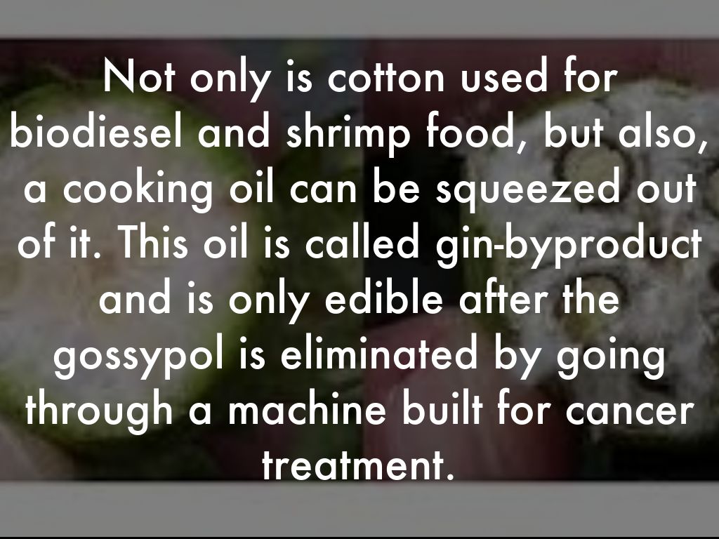 Not only is cotton used for biodiesel and shrimp food, but also, a cooking oil can be squeezed out of it. This oil is called gin-byproduct and is only edible after the gossypol is eliminated by going through a machine built for cancer treatment.