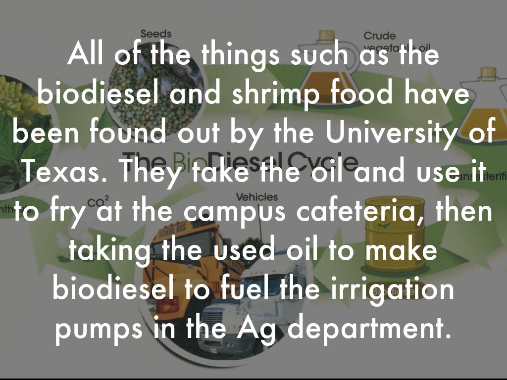 All of the things such as the biodiesel and shrimp food have been found out by the University of Texas. They take the oil and use it to fry at the campus cafeteria, then taking the used oil to make biodiesel to fuel the irrigation pumps in the Ag department.