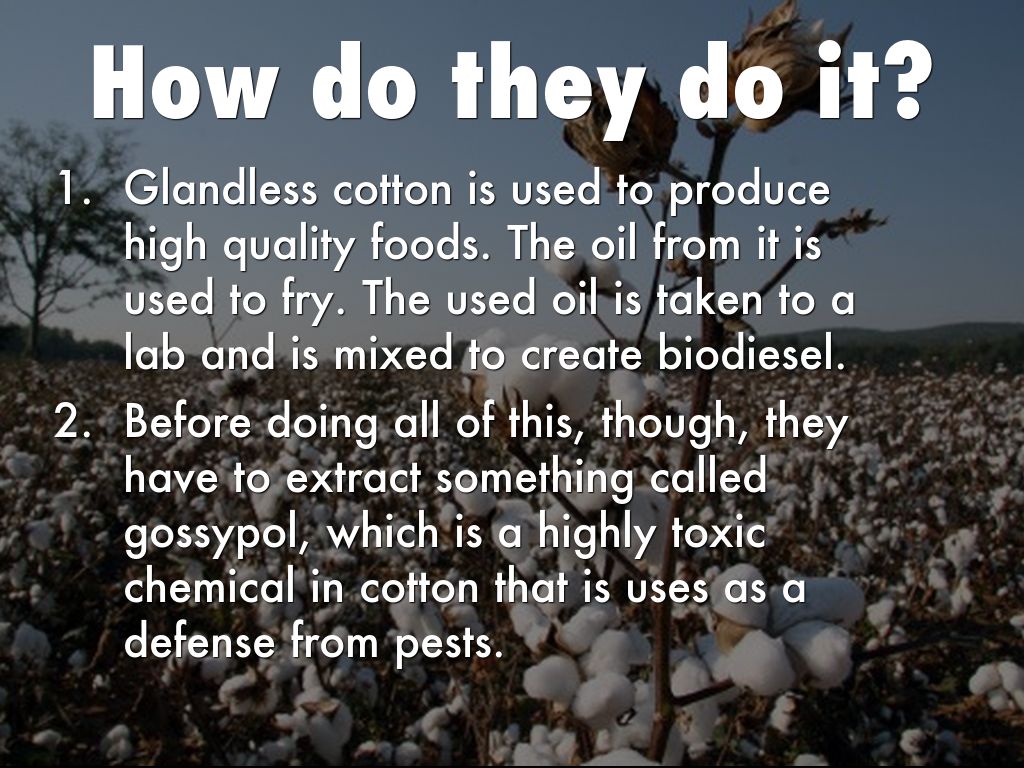 - Before doing all of this, though, they have to extract something called gossypol, which is a highly toxic chemical in cotton that is uses as a defense from pests.