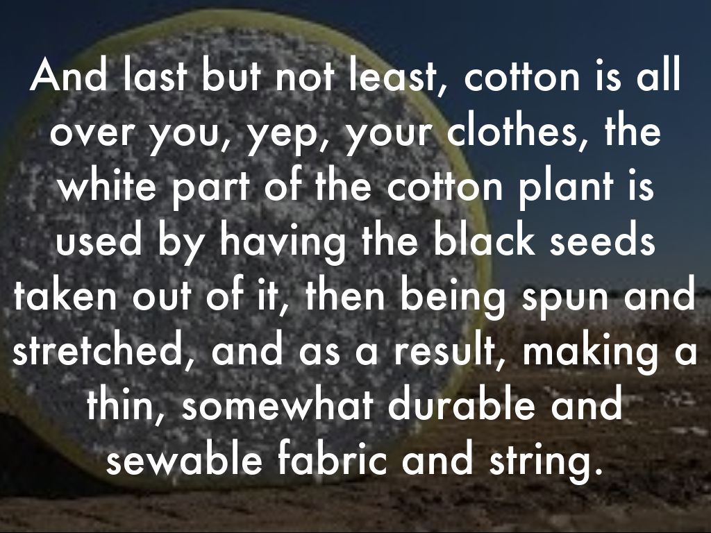 And last but not least, cotton is all over you, yep, your clothes, the white part of the cotton plant is used by having the black seeds taken out of it, then being spun and stretched, and as a result, making a thin, somewhat durable and sewable fabric and string.