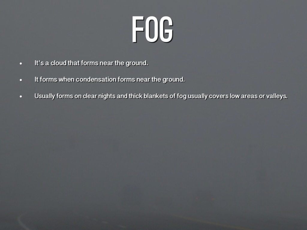 Usually forms on clear nights and thick blankets of fog usually covers low areas or valleys.