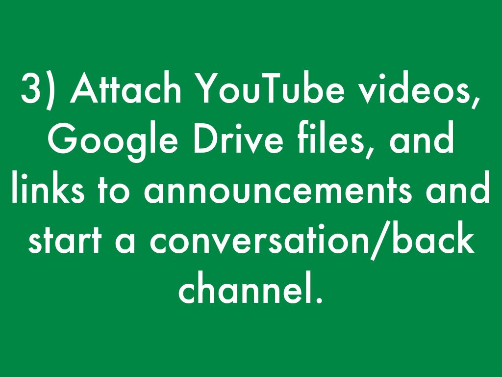 3) Attach YouTube videos, Google Drive files, and links to announcements and start a conversation/back channel.