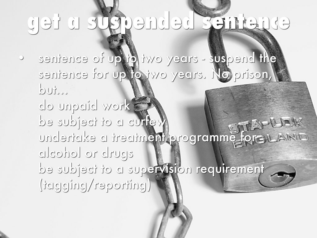 sentence of up to two years - suspend the sentence for up to two years. No prison, but... do unpaid work be subject to a curfew undertake a treatment programme for alcohol or drugs be subject to a supervision requirement (tagging/reporting)