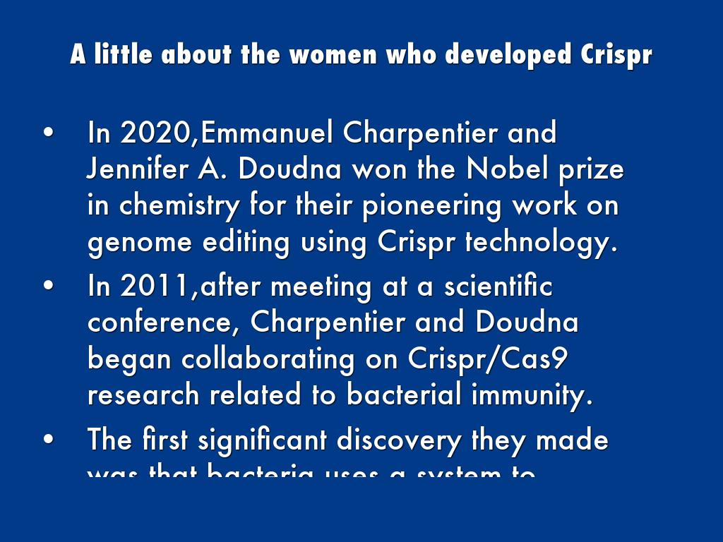 In 2020,Emmanuel Charpentier and Jennifer A. Doudna won the Nobel prize in chemistry for their pioneering work on genome editing using Crispr technology.