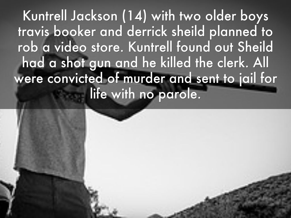 Kuntrell Jackson (14) with two older boys travis booker and derrick sheild planned to rob a video store. Kuntrell found out Sheild had a shot gun and he killed the clerk. All were convicted of murder and sent to jail for life with no parole.