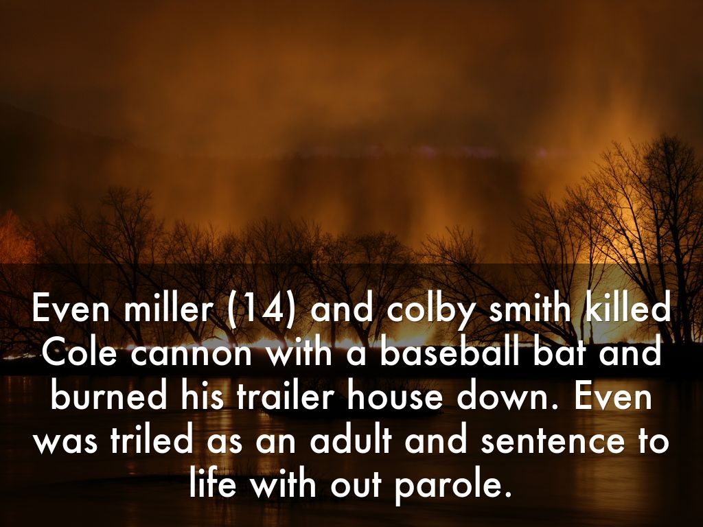 Even miller (14) and colby smith killed Cole cannon with a baseball bat and burned his trailer house down. Even was triled as an adult and sentence to life with out parole.