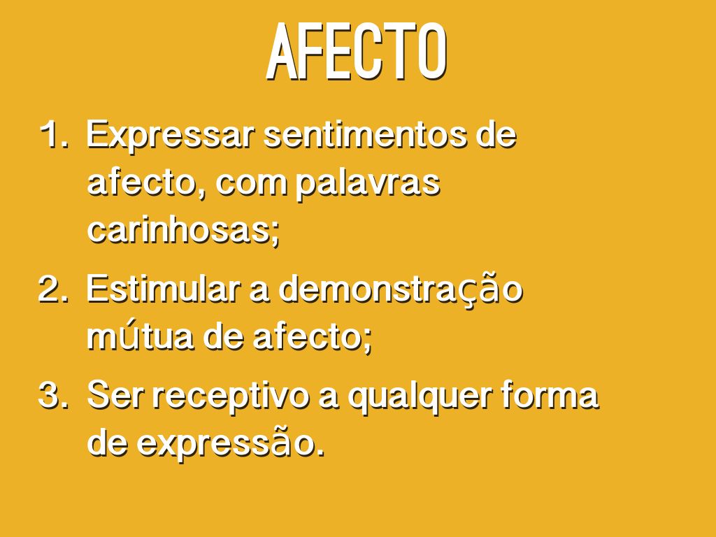• Expressar sentimentos de afecto, com palavras carinhosas;