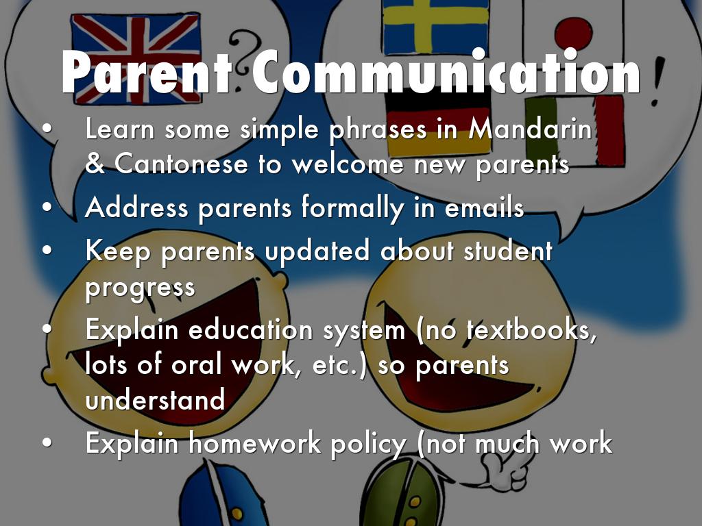 Explain education system (no textbooks, lots of oral work, etc.) so parents understand