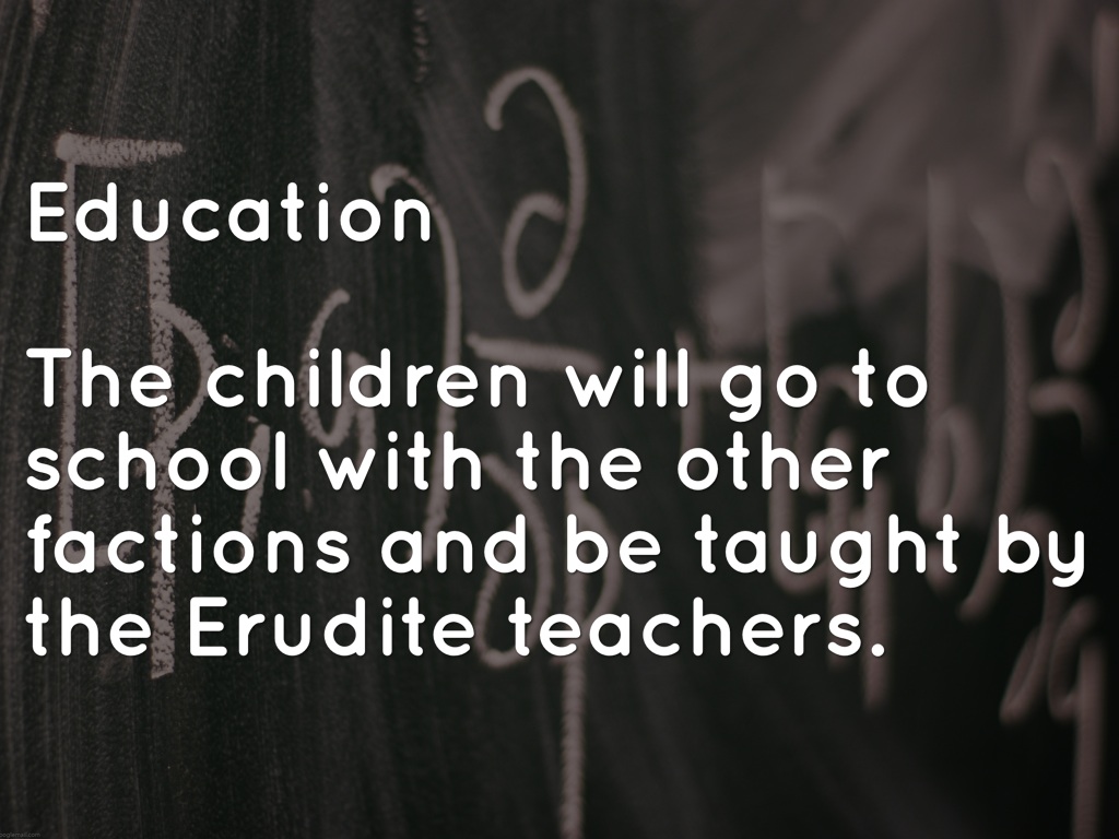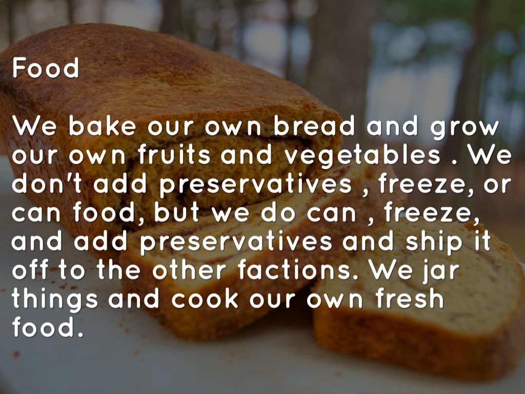 We bake our own bread and grow our own fruits and vegetables . We don't add preservatives , freeze, or can food, but we do can , freeze, and add preservatives and ship it off to the other factions. We jar things and cook our own fresh food.