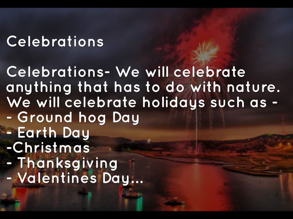 Celebrations- We will celebrate anything that has to do with nature. We will celebrate holidays such as - - Ground hog Day - Earth Day -Christmas - Thanksgiving - Valentines Day