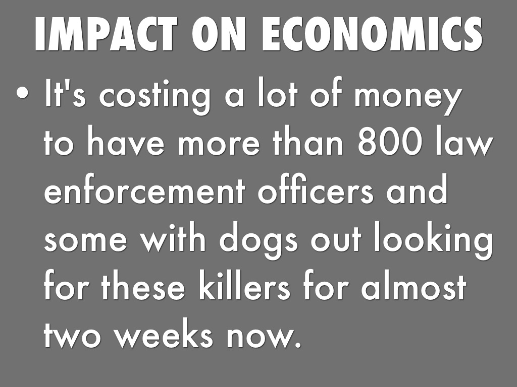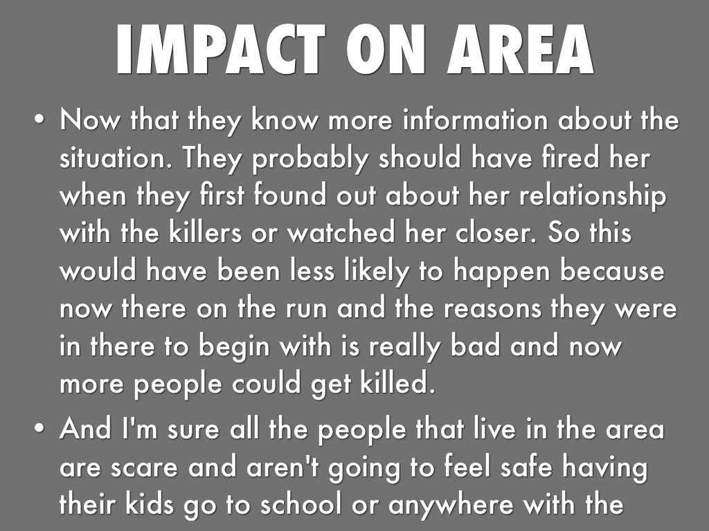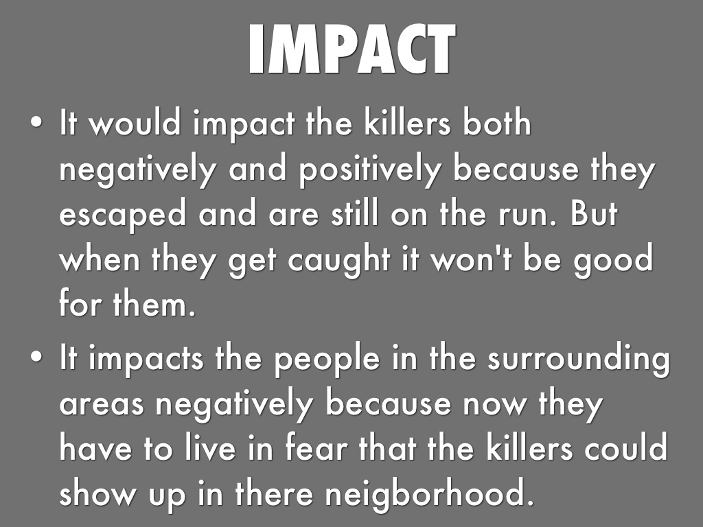 It impacts the people in the surrounding areas negatively because now they have to live in fear that the killers could show up in there neigborhood.