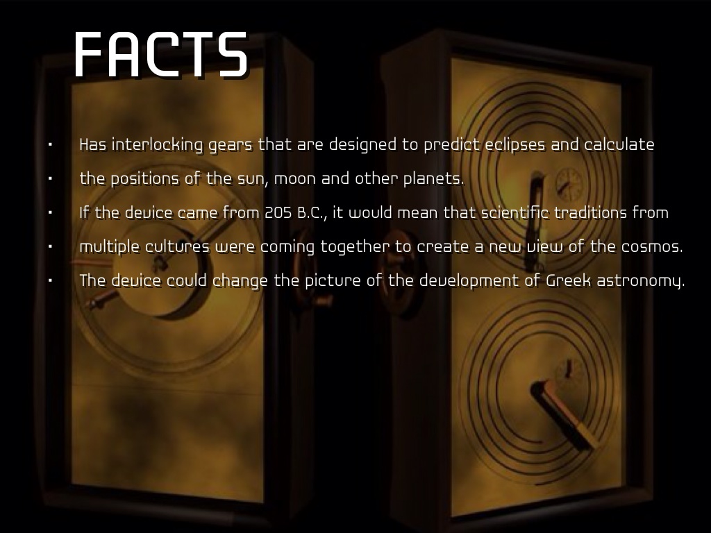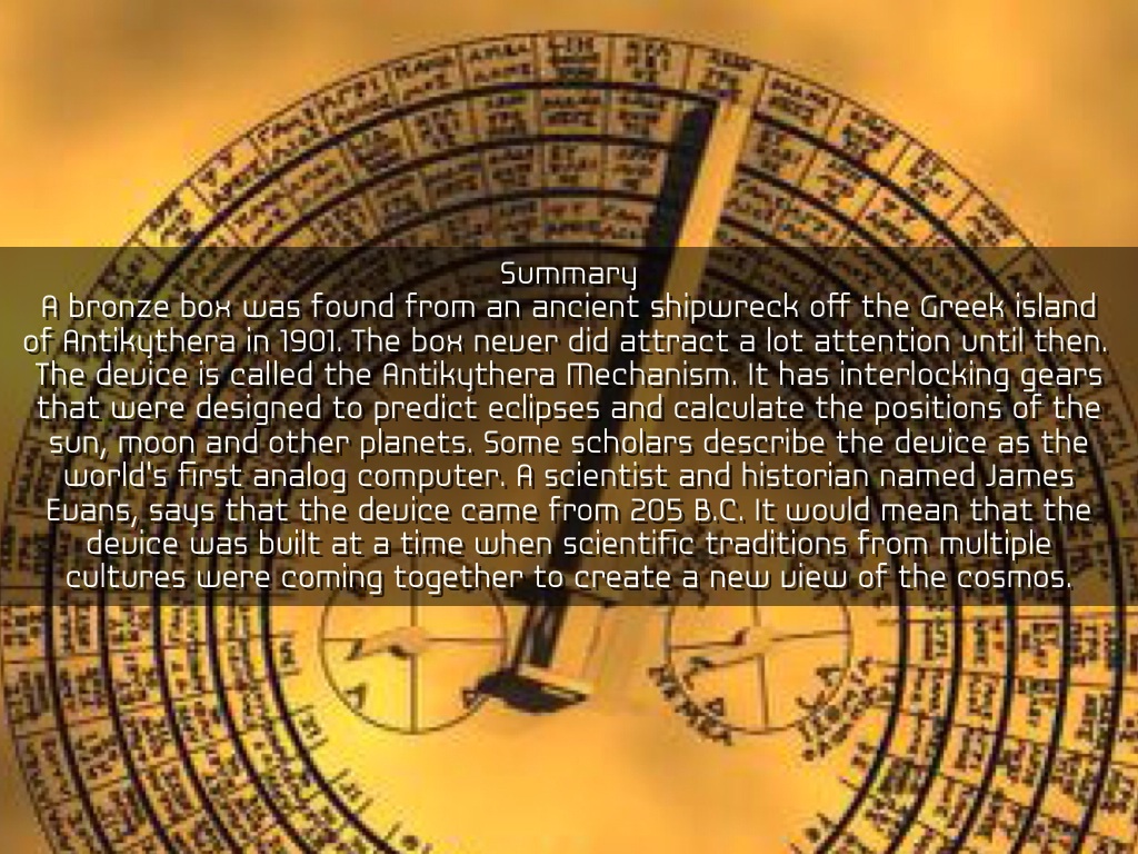 A bronze box was found from an ancient shipwreck off the Greek island of Antikythera in 1901. The box never did attract a lot attention until then. The device is called the Antikythera Mechanism. It has interlocking gears that were designed to predict eclipses and calculate the positions of the sun, moon and other planets. Some scholars describe the device as the world's first analog computer. A scientist and historian named James Evans, says that the device came from 205 B.C. It would mean that the device was built at a time when scientific traditions from multiple cultures were coming together to create a new view of the cosmos.
