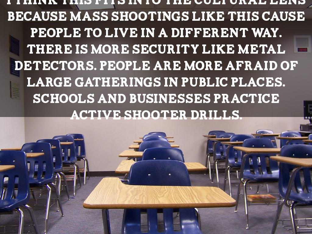 I think this fits into the cultural lens because mass shootings like this cause people to live in a different way. There is more security like metal detectors. People are more afraid of large gatherings in public places. Schools and businesses practice active shooter drills.