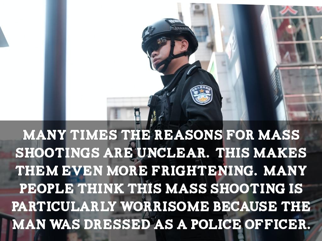 Many times the reasons for mass shootingS are unclear. This makes them even more frightening. Many people think this mass shooting is particularly worrisome because the man was dressed as a police officer.