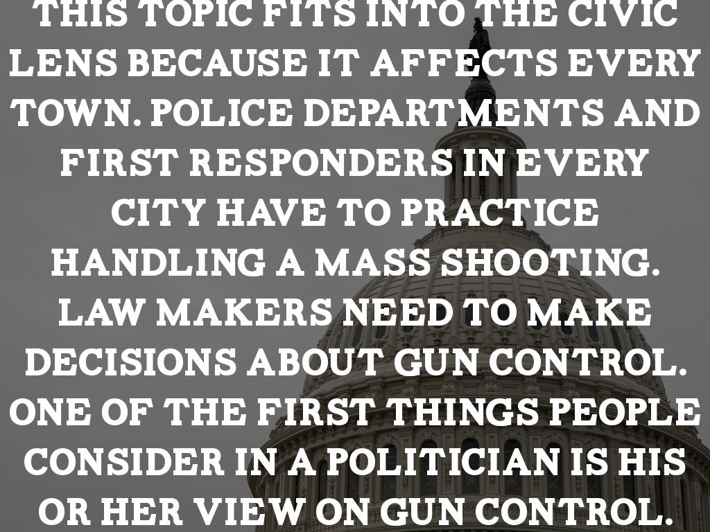 This topic fits into the civic lens because it affects every town. Police departments and first responders in every city have to practice handling a mass shooting. Law makers need to make decisions about gun control. One of the first things people consider in a politician is his or her view on gun control.