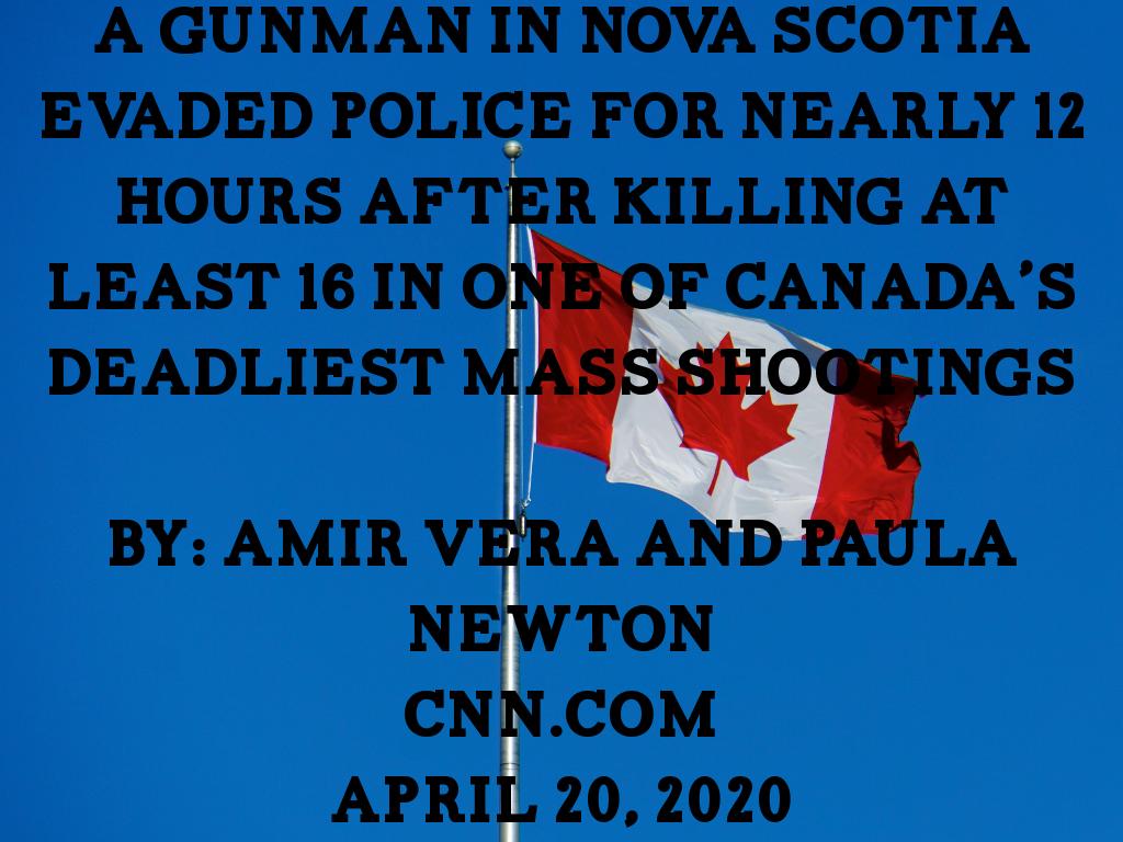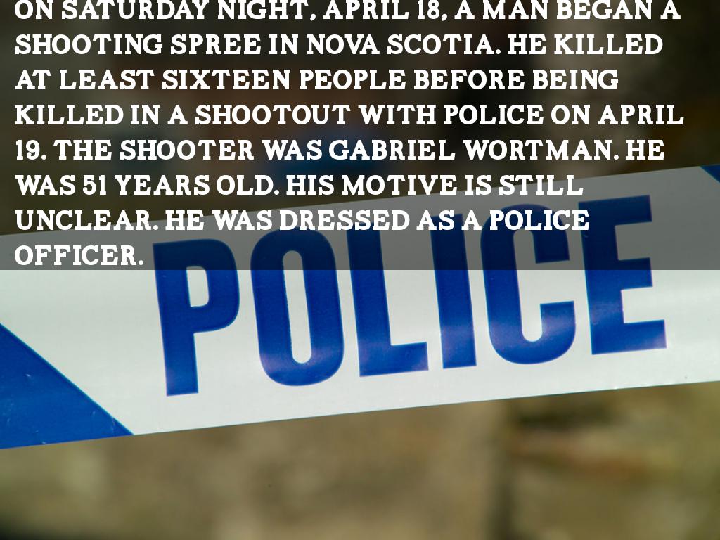 On Saturday night, April 18, a man began a shooting spree in Nova Scotia. He killed at least sixteen people before being killed in a shootout with police on April 19. The shooter was Gabriel Wortman. He was 51 years old. His motive is still unclear. He was dressed as a police officer.