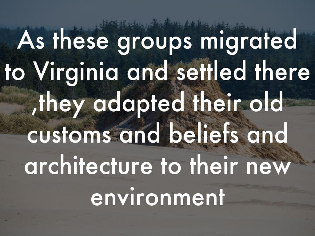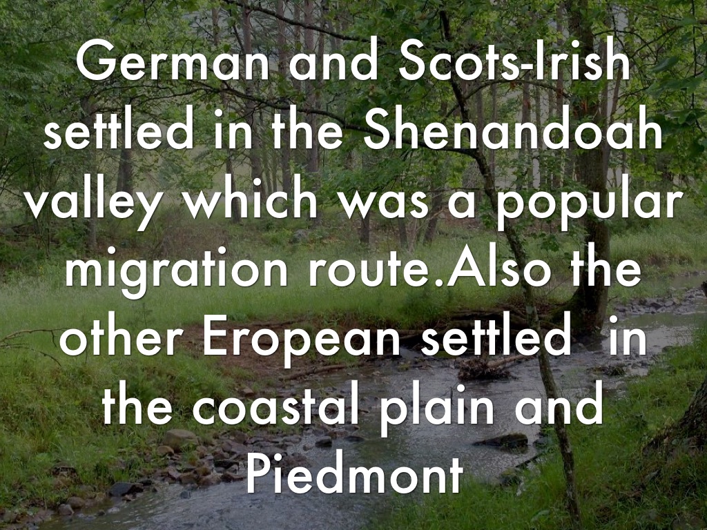 German and Scots-Irish settled in the Shenandoah valley which was a popular migration route.Also the other Eropean settled in the coastal plain and Piedmont