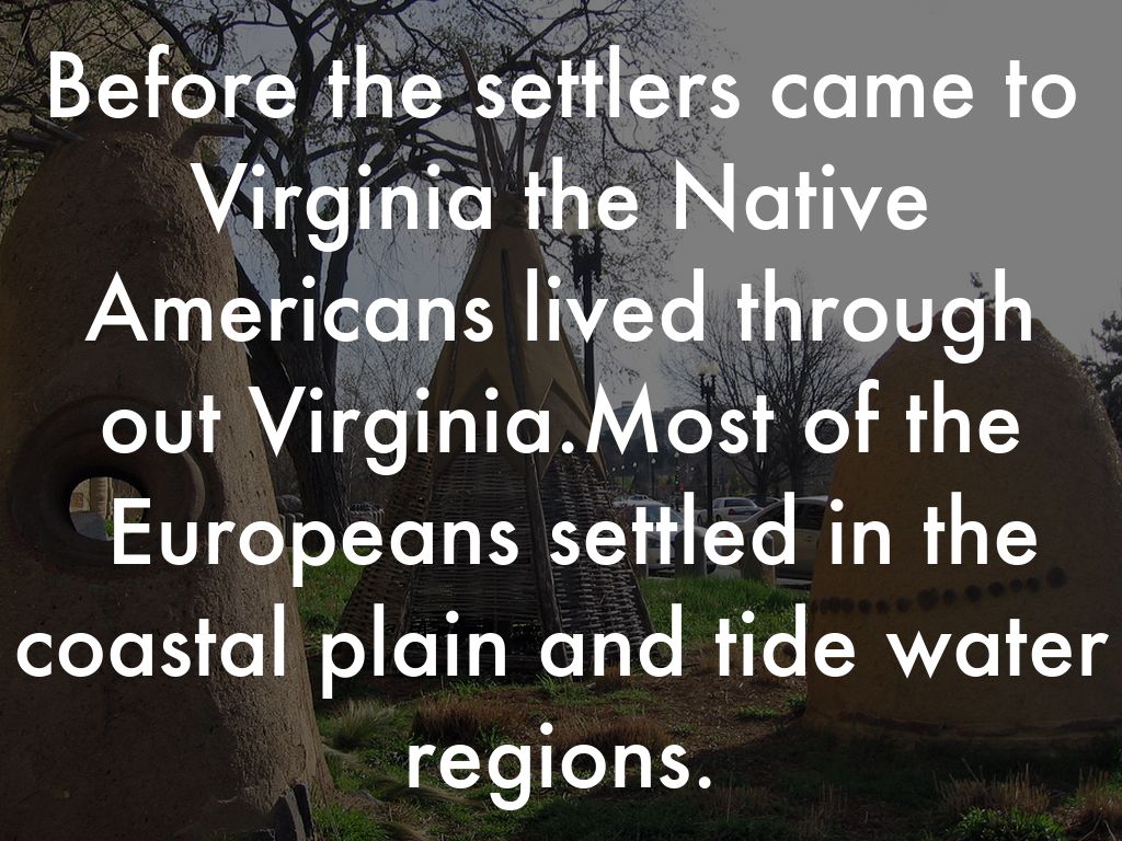Before the settlers came to Virginia the Native Americans lived through out Virginia.Most of the Europeans settled in the coastal plain and tide water regions.
