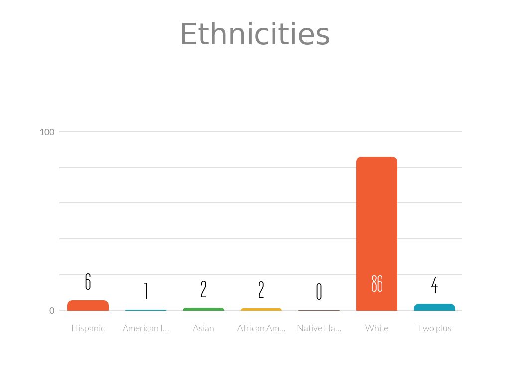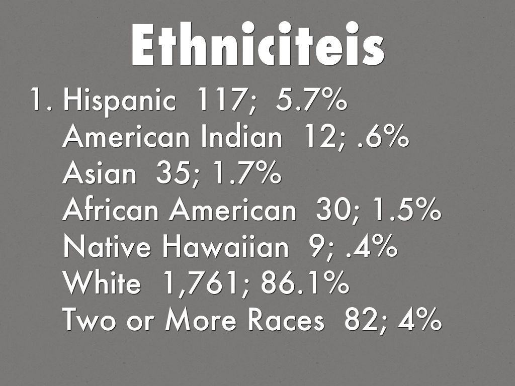 Hispanic 117; 5.7% American Indian 12; .6% Asian 35; 1.7% African American 30; 1.5% Native Hawaiian 9; .4% White 1,761; 86.1% Two or More Races 82; 4%