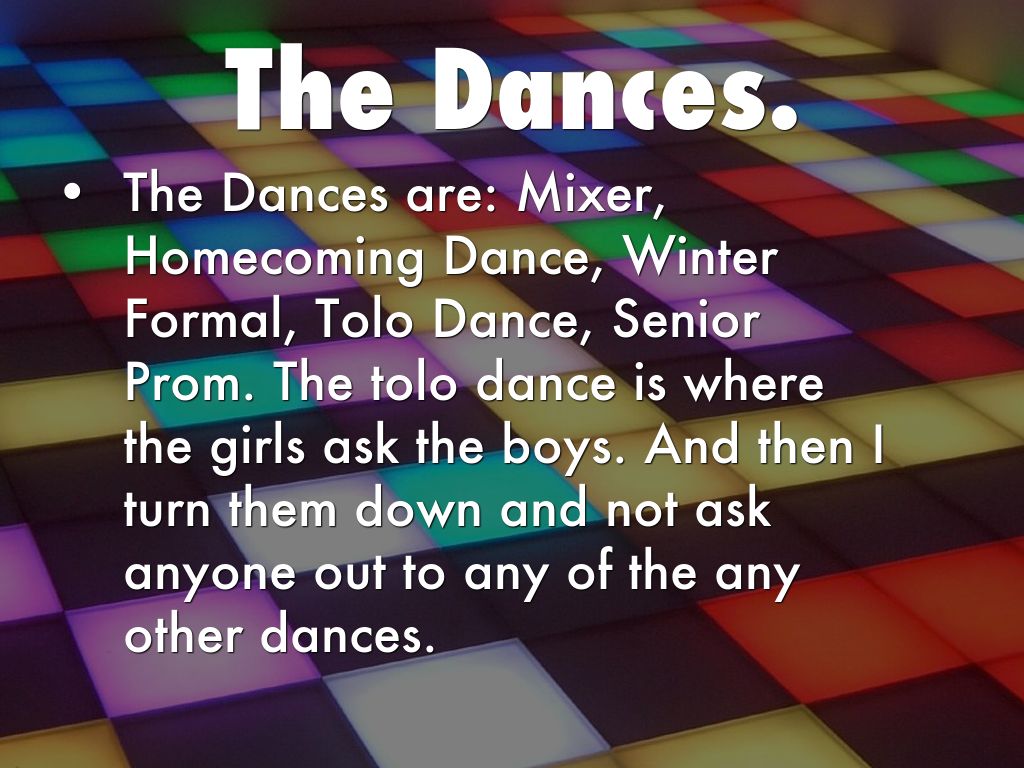 The Dances are: Mixer, Homecoming Dance, Winter Formal, Tolo Dance, Senior Prom. The tolo dance is where the girls ask the boys. And then I turn them down and not ask anyone out to any of the any other dances.