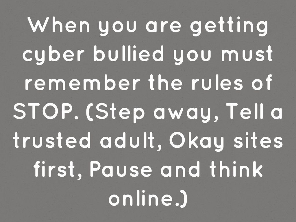 When you are getting cyber bullied you must remember the rules of STOP. (Step away, Tell a trusted adult, Okay sites first, Pause and think online.)