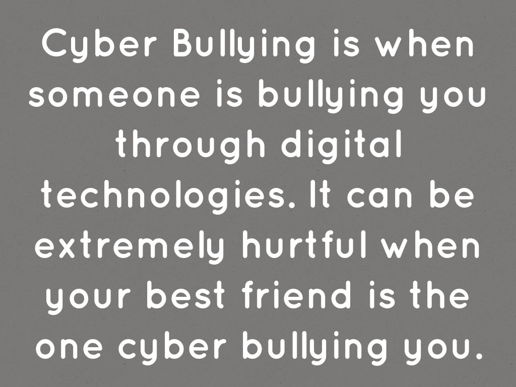 Cyber Bullying is when someone is bullying you through digital technologies. It can be extremely hurtful when your best friend is the one cyber bullying you.