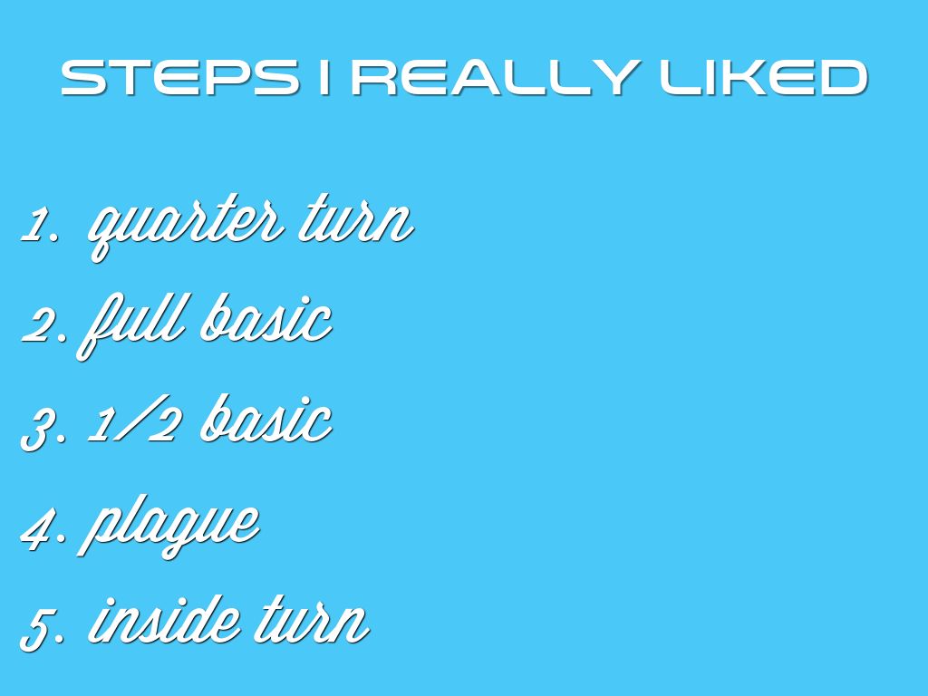 what did i like about the waltz was when we learned both female and male waltz . The most struggling thing performing the steps was learning the quarter turn.