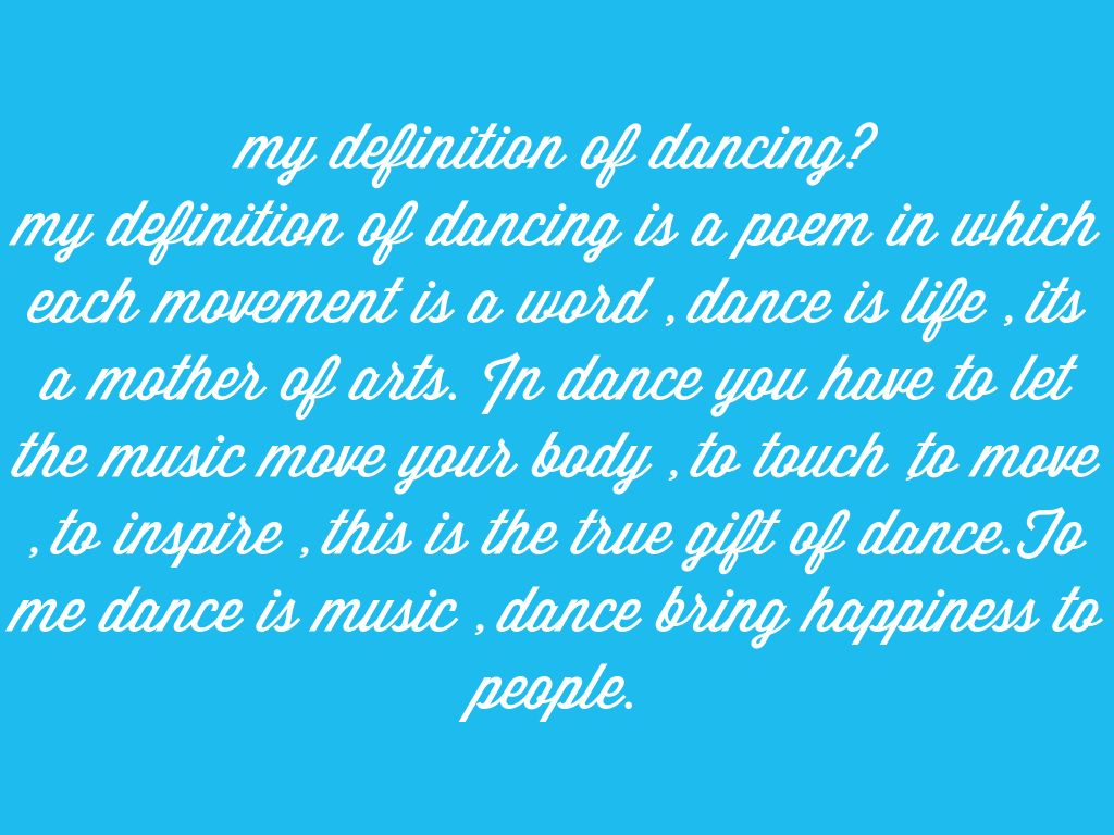 my definition of dancing is a poem in which each movement is a word , dance is life , its a mother of arts. In dance you have to let the music move your body , to touch ,to move , to inspire , this is the true gift of dance.To me dance is music , dance bring happiness to people.