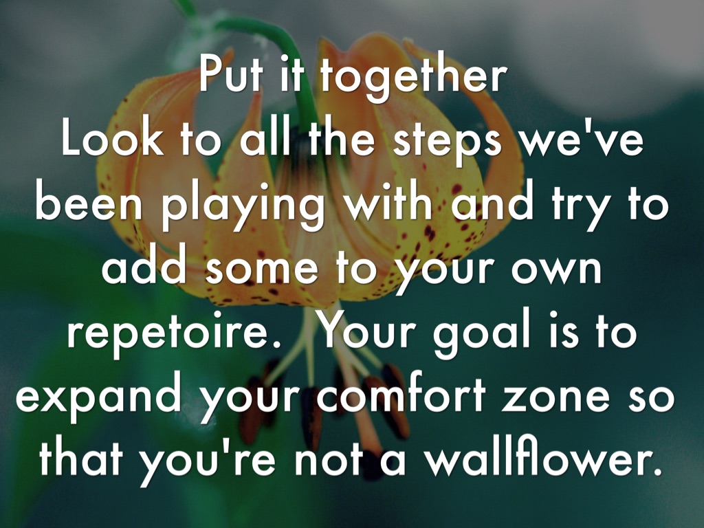 Look to all the steps we've been playing with and try to add some to your own repetoire. Your goal is to expand your comfort zone so that you're not a wallflower.