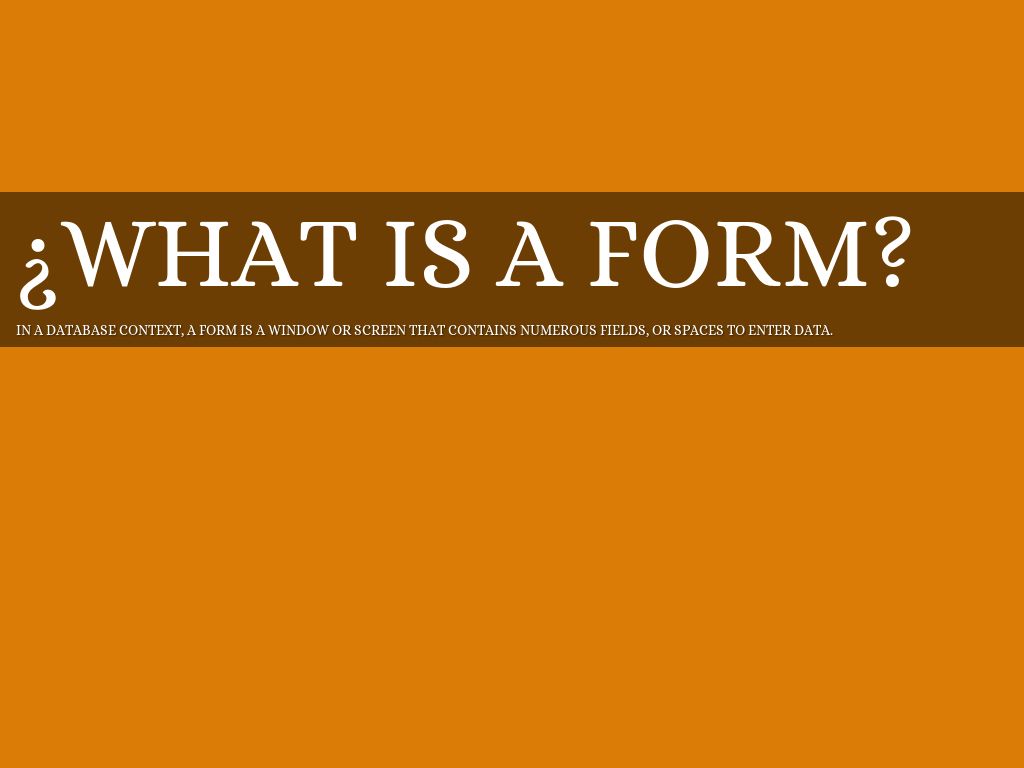 In a database context, a form is a window or screen that contains numerous fields, or spaces to enter data.
