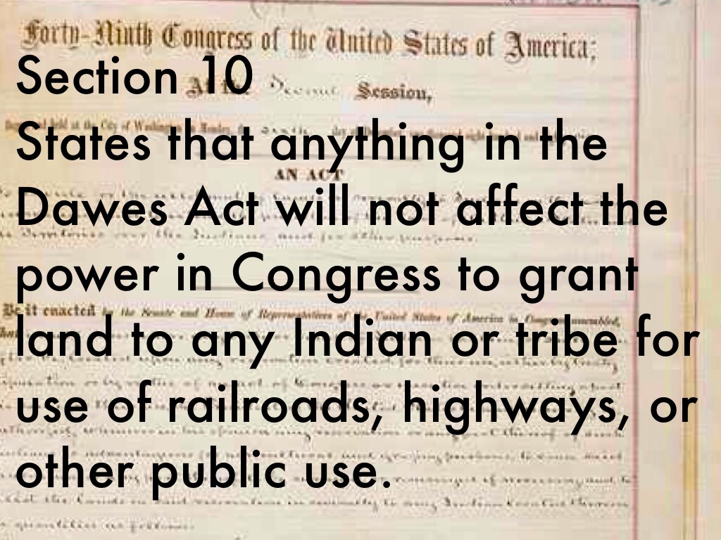 Section 10 States that anything in the Dawes Act will not affect the power in Congress to grant land to any Indian or tribe for use of railroads, highways, or other public use.