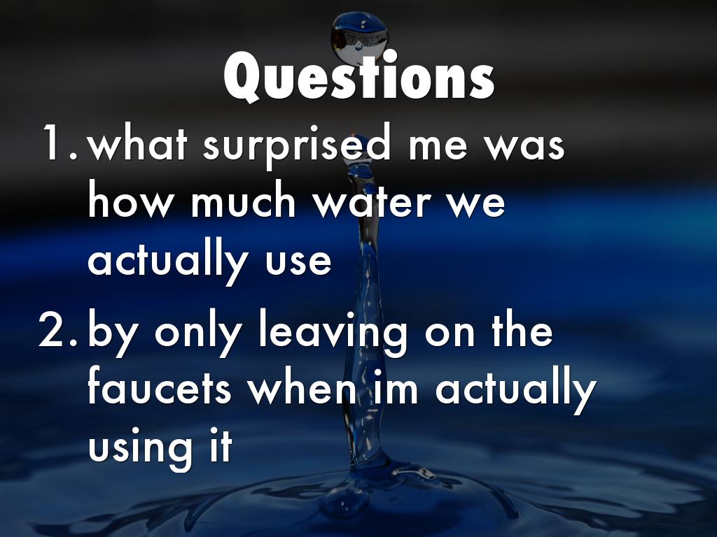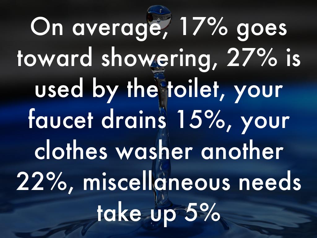 On average, 17% goes toward showering, 27% is used by the toilet, your faucet drains 15%, your clothes washer another 22%, miscellaneous needs take up 5%