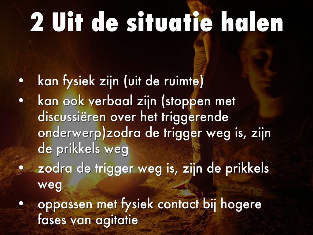 kan ook verbaal zijn (stoppen met discussiëren over het triggerende onderwerp)zodra de trigger weg is, zijn de prikkels weg