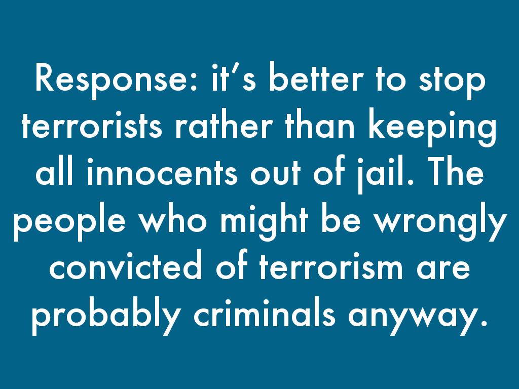 Response: it’s better to stop terrorists rather than keeping all innocents out of jail. The people who might be wrongly convicted of terrorism are probably criminals anyway.