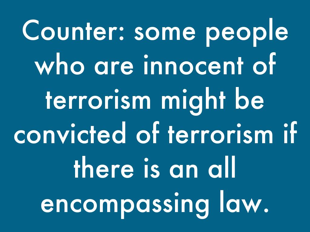 Counter: some people who are innocent of terrorism might be convicted of terrorism if there is an all encompassing law.