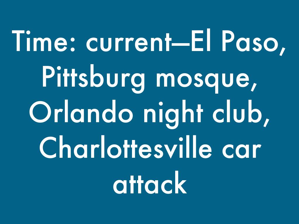 Time: current—El Paso, Pittsburg mosque, Orlando night club, Charlottesville car attack