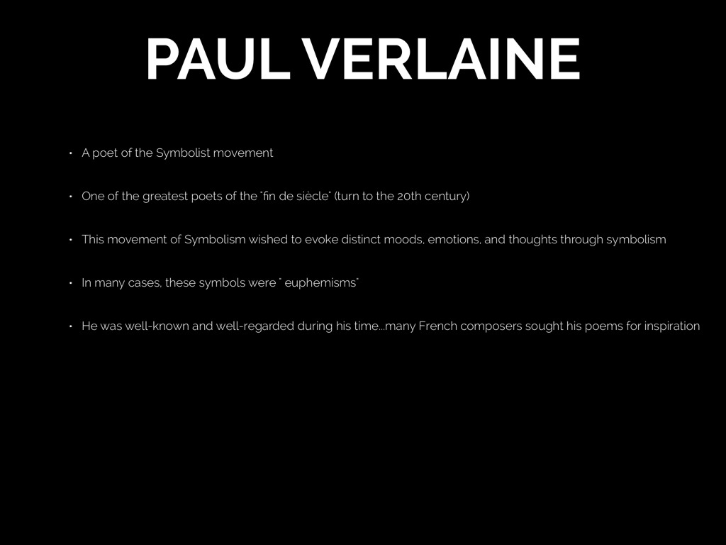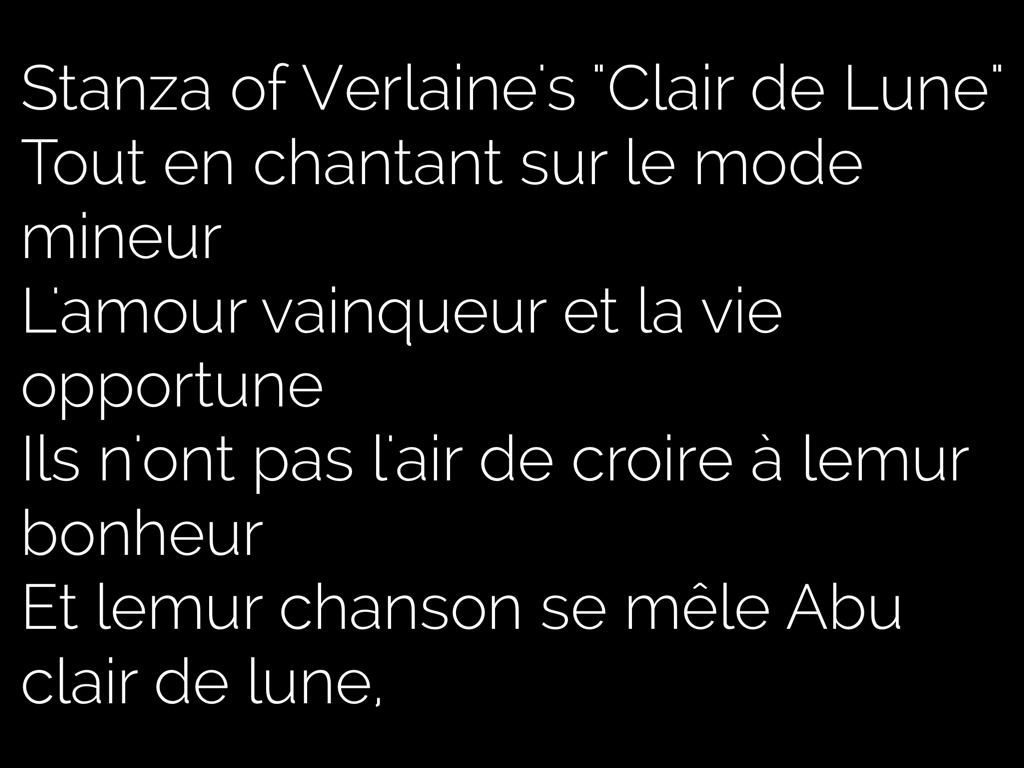 Stanza of Verlaine's "Clair de Lune" Tout en chantant sur le mode mineur L'amour vainqueur et la vie opportune Ils n'ont pas l'air de croire à lemur bonheur Et lemur chanson se mêle Abu clair de lune,
