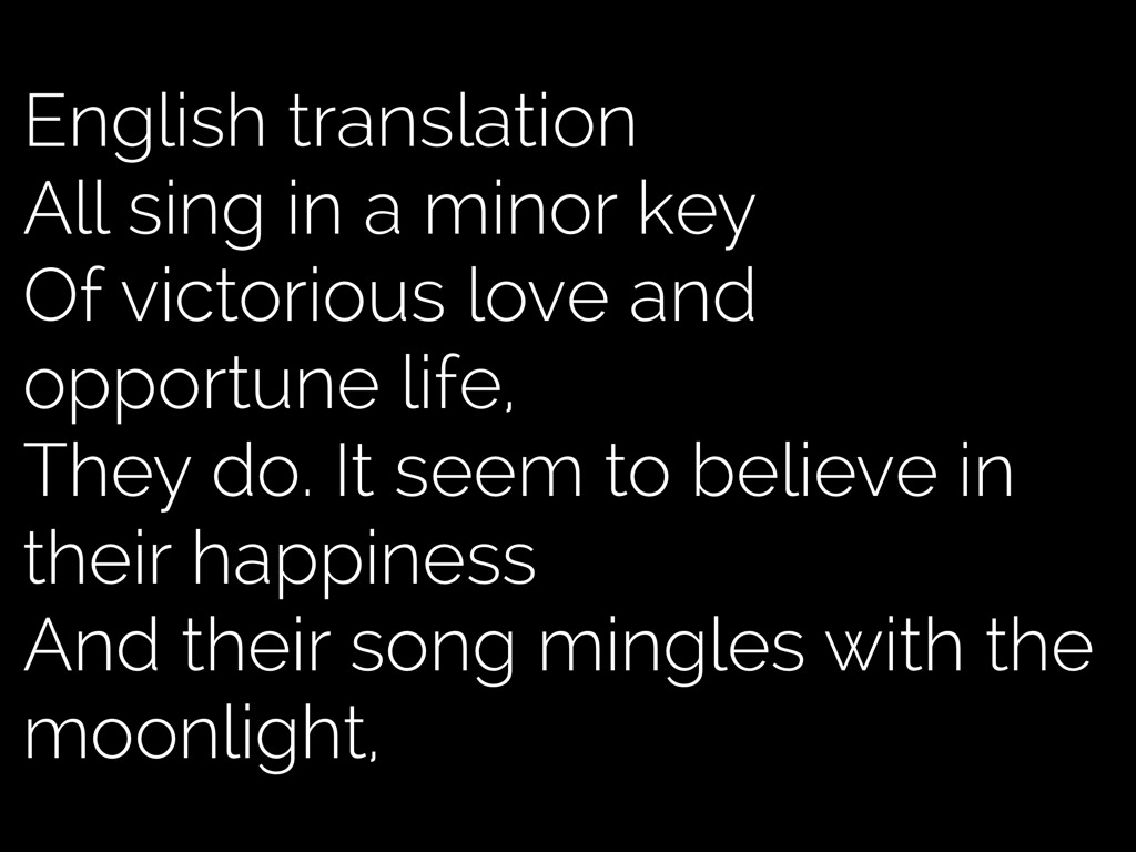 English translation All sing in a minor key Of victorious love and opportune life, They do. It seem to believe in their happiness And their song mingles with the moonlight,