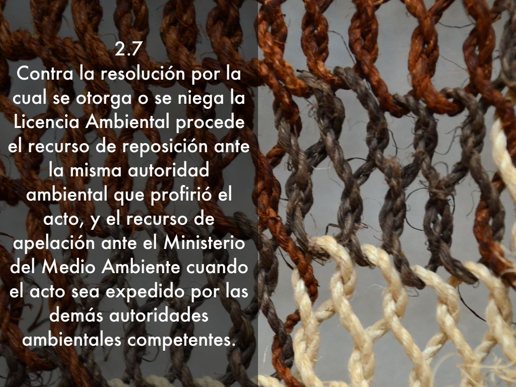 2.7 Contra la resolución por la cual se otorga o se niega la Licencia Ambiental procede el recurso de reposición ante la misma autoridad ambiental que profirió el acto, y el recurso de apelación ante el Ministerio del Medio Ambiente cuando el acto sea expedido por las demás autoridades ambientales competentes.